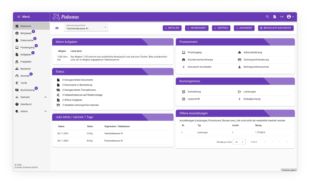Mit Paloma vereinfachen Sie komplexe Verwaltungsaufgaben und steigern die Effizienz Ihres Vereins. Unsere Software bietet eine intuitive Benutzeroberfläche und umfassende Funktionen, die speziell für die Bedürfnisse von Sterbegeldversicherungen entwickelt wurden.